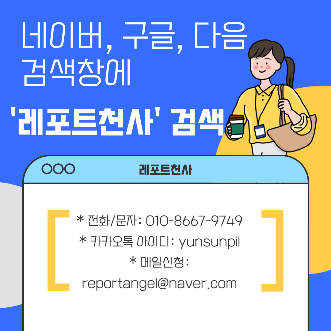 이제는 평생 교육 시대이죠. 주변에 있는 학생들도 레포트를 하기 위해 많은 시간을 투자합니다. 그럼에도 좋은 결과물을 내기는 어렵지요. 특히나 늦은 공부를 시작하신 분들에게는 너무 어려운 요구가 아닐까요? 그러한 분들께는 레포트대행 서비스를 하고 있는 '레포트천사'가 도움이 될 거예요.