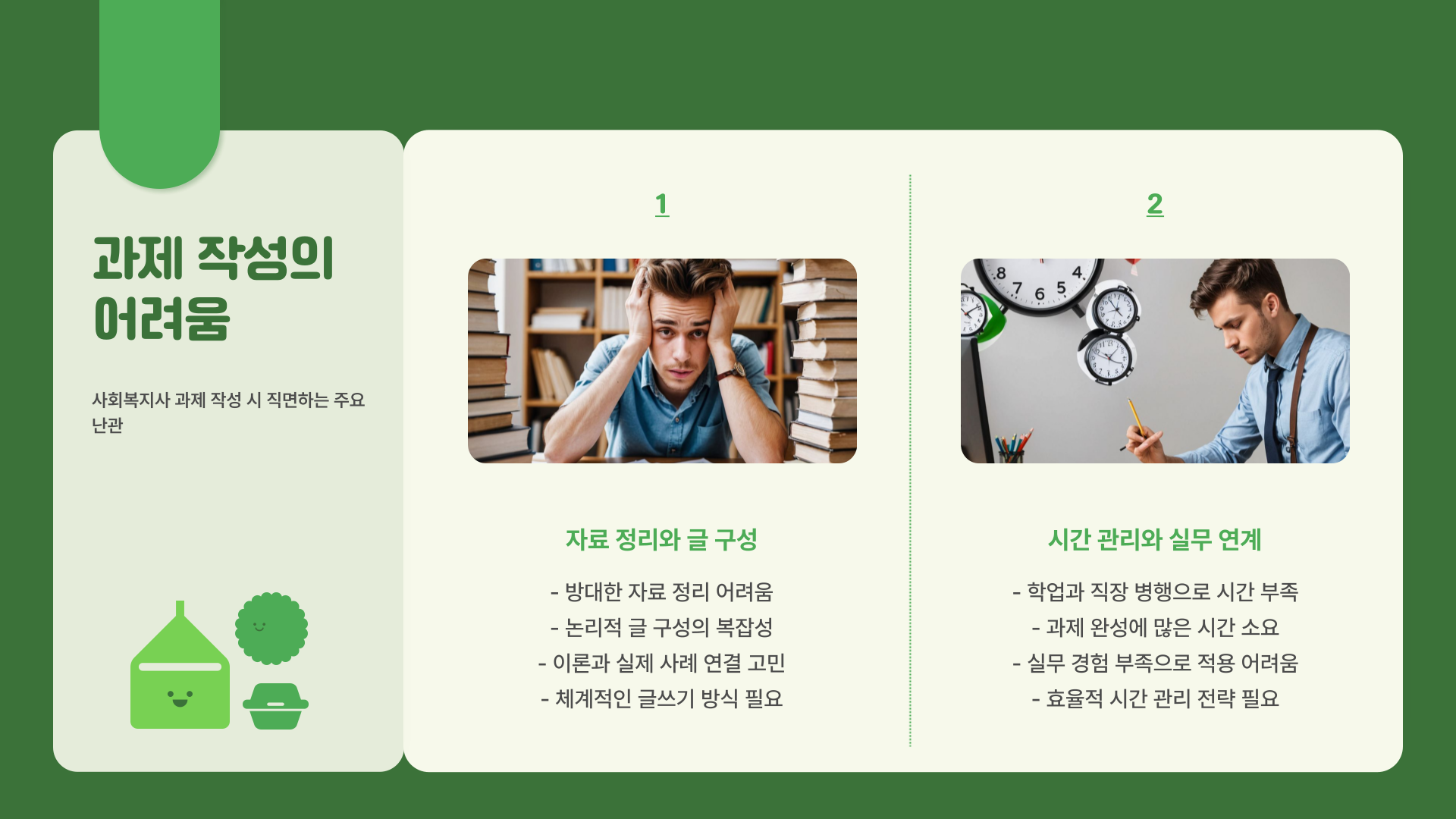 저는 과제 작성 과정에서 가장 힘들었던 점이 자료 정리와 글의 흐름을 맞추는 것이었어요. 직장과 가정을 병행하면서 학업을 이어가다 보니 시간 관리가 쉽지 않았고, 글을 구성하는 데도 어려움을 느꼈어요. 특히 사회복지 이론을 실제 사례와 연결하는 과정에서 많은 고민이 필요했어요. 이러한 어려움을 극복하기 위해서는 체계적인 글쓰기 방식과 논리적인 자료 정리가 필수적이더라고요.