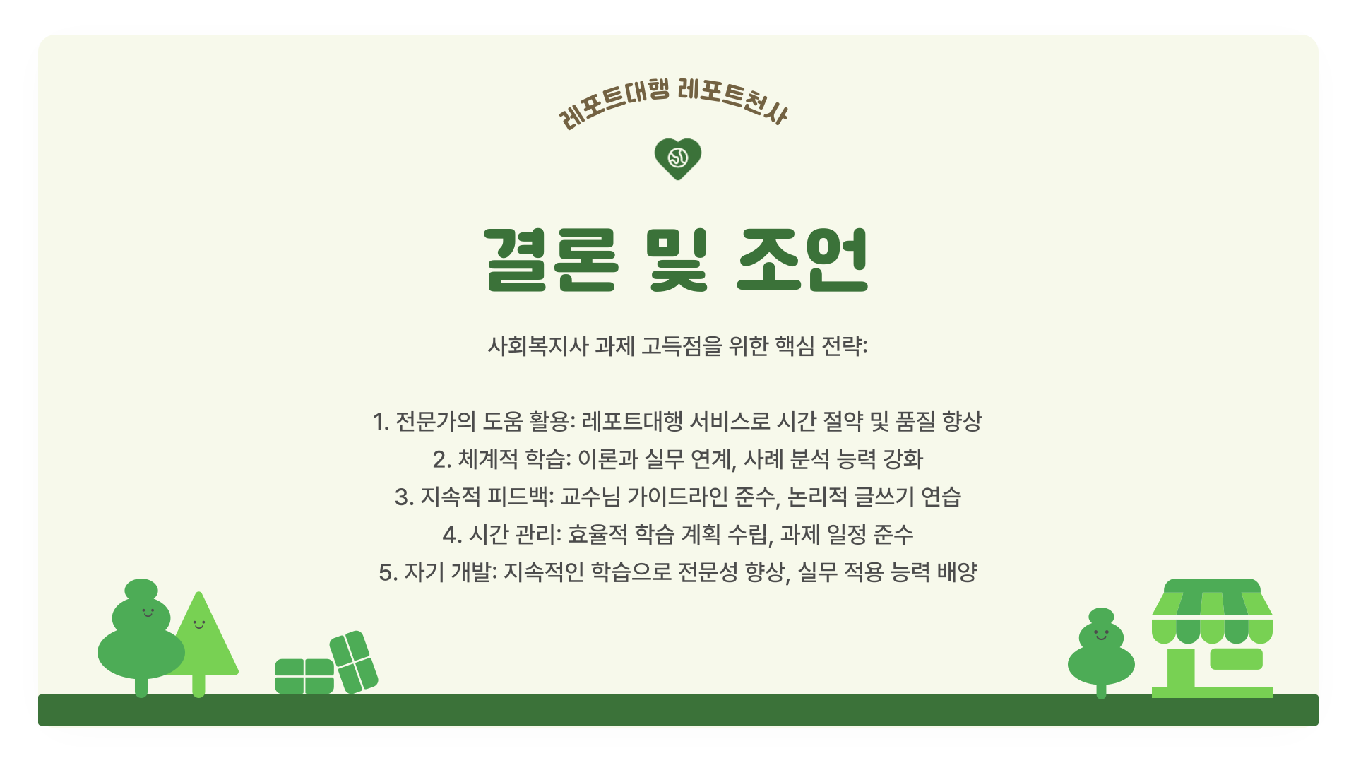 여러 방법을 고민하던 끝에, 저는 레포트대행 서비스를 활용해보기로 했어요. 과제 작성에 대한 부담을 줄이고 전문가의 피드백을 받을 수 있는 방법이었죠. 특히 사회복지사 과제를 준비하는 데 있어 전문적인 자료 정리와 논리적인 전개를 지원받을 수 있어서 큰 도움이 되었어요. 학업과 직장을 병행하는 분들에게는 이런 방법이 시간을 효율적으로 활용하는 전략이 될 수 있어요.