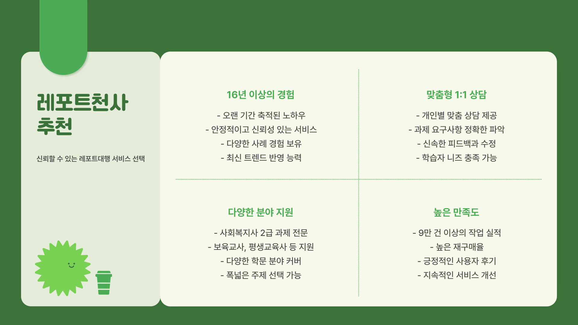 여러 업체 중에서 제가 선택한 곳은 바로 레포트천사예요. 이곳은 학점은행제, 사이버대학, 방통대 전문 레포트대행 업체로, 사회복지사 2급, 보육교사, 평생교육사 등 다양한 분야의 과제를 지원해 줘요. 특히 16년 이상의 운영 경험과 9만 건 이상의 작업 실적이 있어서 신뢰도가 높았어요. 저는 1:1 맞춤 상담과 신속한 피드백을 받으면서 과제 완성도를 높일 수 있었답니다.