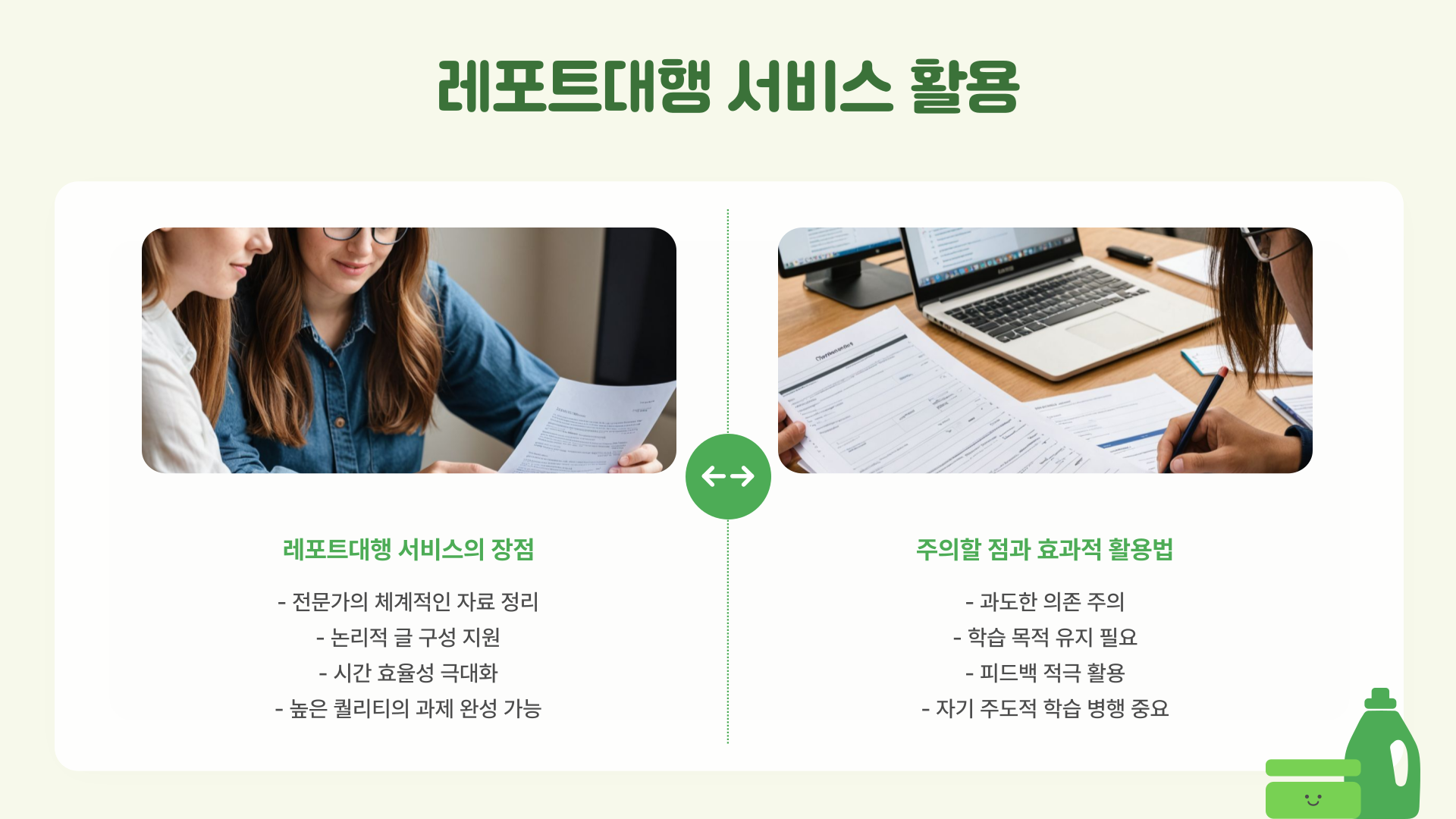 레포트대행 업체를 선택할 때는 단순히 가격만 비교해서는 안 돼요. 후기, 상담 과정에서 제공되는 자료, 피드백의 신속함 등을 꼼꼼히 따져봐야 합니다. 저는 여러 곳을 비교한 끝에, 체계적이고 전문적인 지원을 제공하는 레포트천사를 선택했어요. 신속한 상담과 수정 요청 반영이 원활해 만족스러웠답니다.