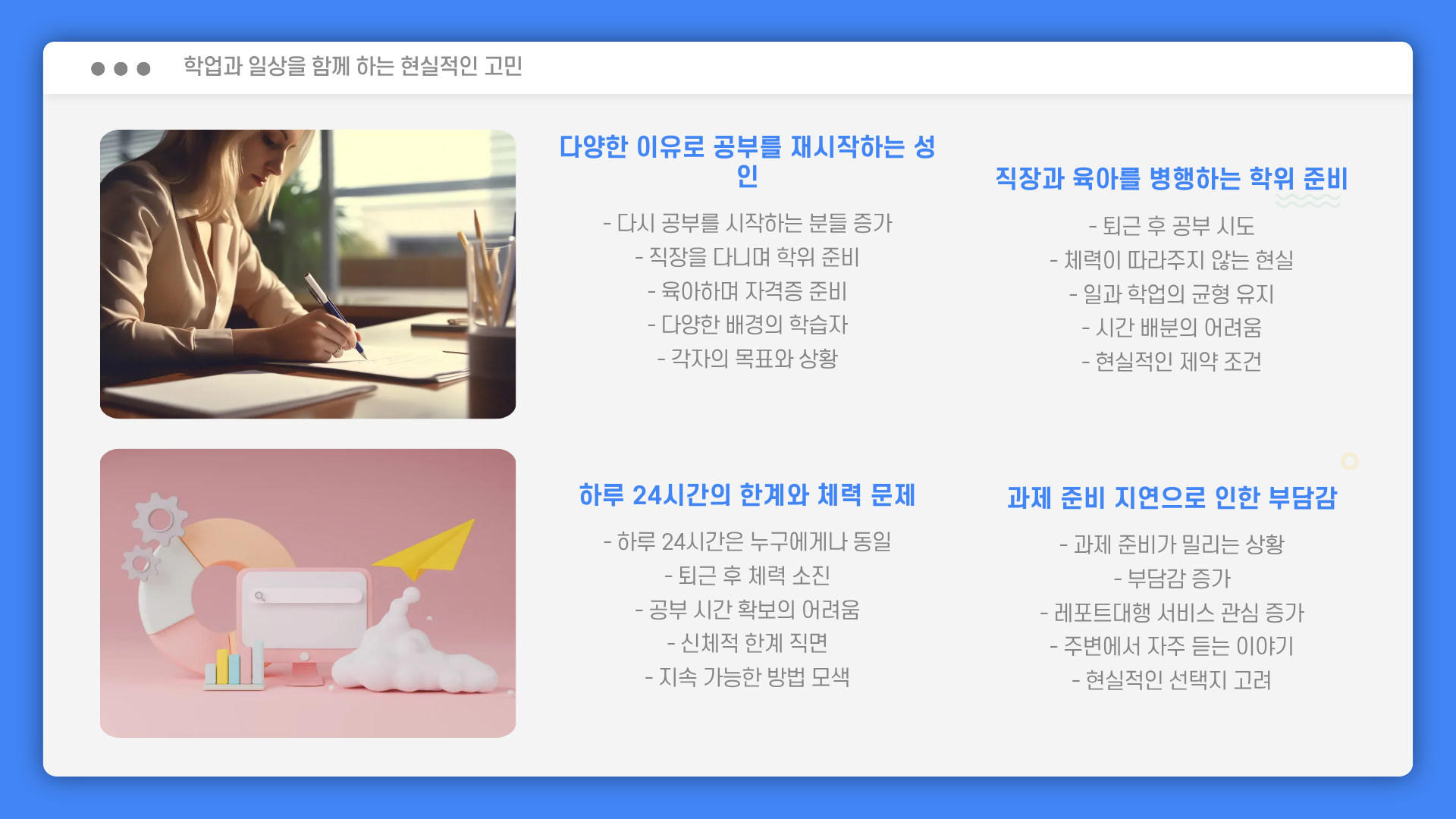 학업을 병행하는 사람에게 가장 부족한 것은 시간이다. 특히 직장인이나 육아 중인 분들은 하루가 금방 지나간다. 이런 상황에서 모든 과제를 직접 준비하려다 보면 체력적으로 지치는 순간이 오기도 한다. 그래서 일부 사람들은 레포트대행을 활용해 시간을 나누기도 한다. 남는 시간은 시험 준비나 전공 공부에 더 집중할 수 있기 때문이다.