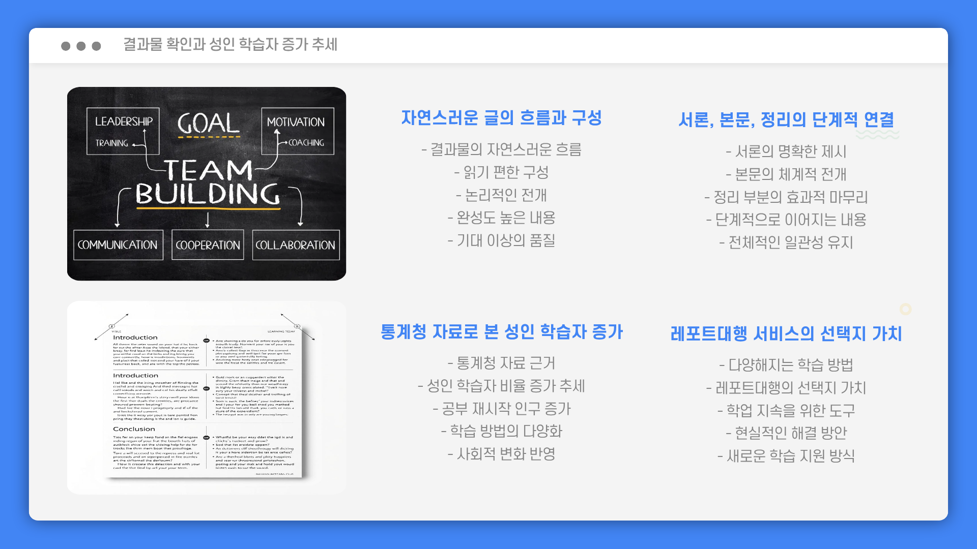 자료를 받아보면서 가장 먼저 느낀 것은 글의 흐름이 자연스럽다는 점이었다. 서론과 본문, 정리 부분이 단계적으로 이어져 있어 읽기 편했다. 통계청 자료에 따르면 성인 학습자의 비율은 꾸준히 증가하고 있다고 한다. 공부를 다시 시작하는 사람이 많아질수록 학습 방법도 다양해지고 있다. 이런 흐름 속에서 레포트대행 서비스 역시 하나의 선택지가 될 수 있다는 생각이 들었다.