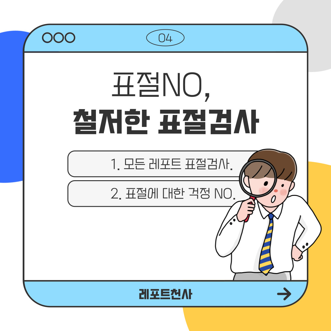 많은 학점은행제 평생교육원, 방송통신대, 대학교 등에서 레포트에 대한 표절 검사를 하고 있습니다. 레포트천사에서는 레포트대행을 맡기신 분들의 걱정을 덜기 위하여 엄격한 표절 검사(카피킬러)를 시행한 후 고객님들에게 전달하고 있습니다. 그러니 표절에 대한 걱정을 하지 마시고 믿고 맡겨주세요.
