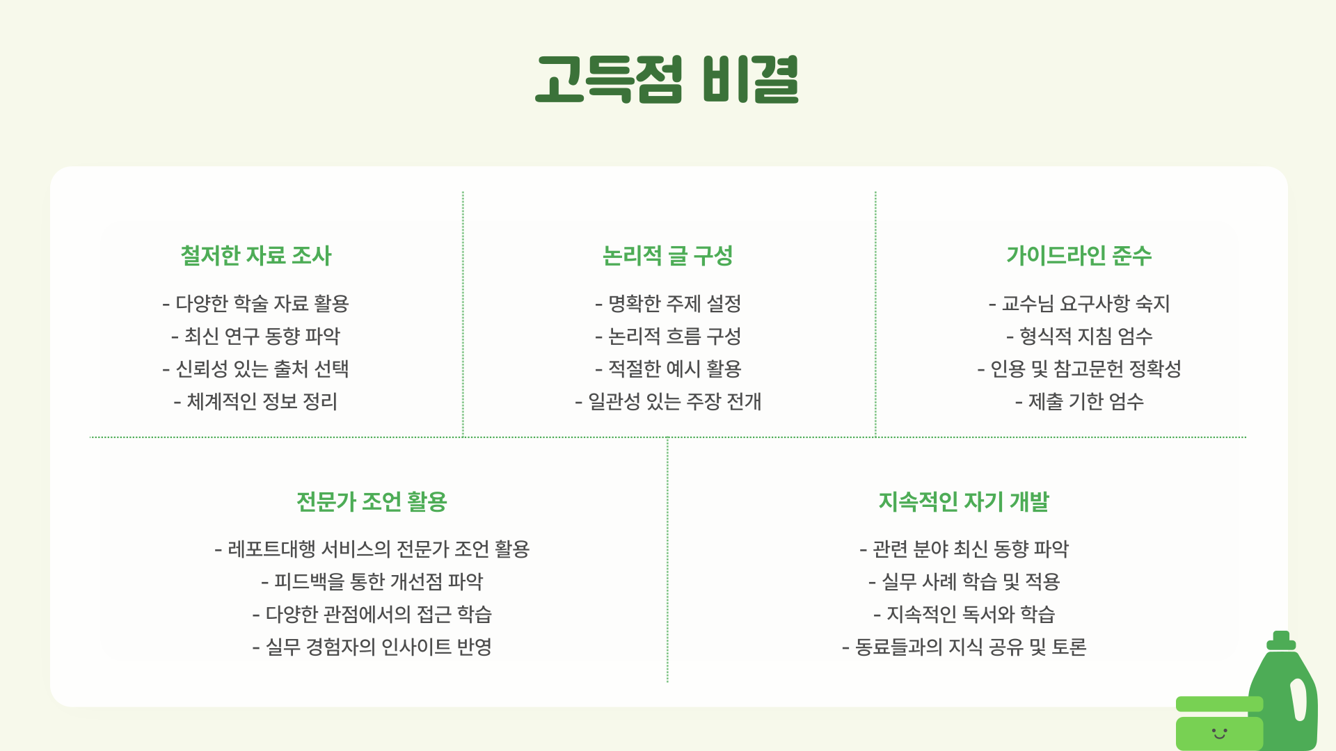 과제에서 고득점을 받으려면 철저한 자료 조사와 논리적인 글 구성이 필수예요. 저는 전문가의 도움을 받으며 주어진 주제를 어떻게 풀어나가야 할지 배웠고, 교수님께도 좋은 평가를 받을 수 있었어요. 가장 중요한 것은 교수님의 가이드라인을 꼼꼼히 따르고, 논리적인 전개와 명확한 사례를 활용하는 것이었어요. 이러한 전략이 고득점의 핵심 요소라고 생각해요.
